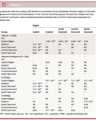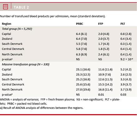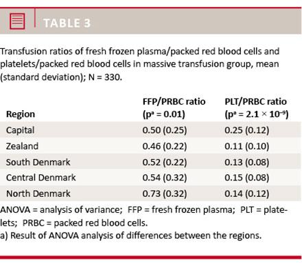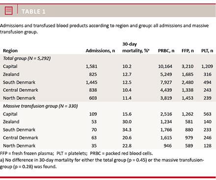 No differences in 30-day mortality between regions could be identified for the total group (p = 0.45) or the massive transfusion group (p = 0.28) (Table 1).
