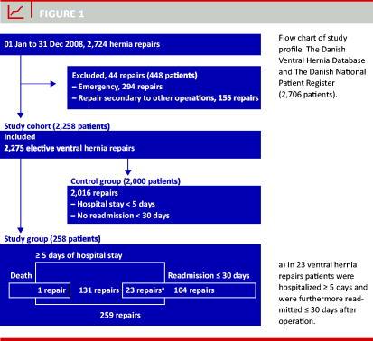 No detailed large-scale data are available to explain prolonged length of hospital stay (LOS) and readmission following ventral hernia repair. Recent nationwide Danish data from the 2005-2006 period have shown an unsatisfactory 30-day outcome following elective incisional hernia repair [1]. The study comprised 2,896 incisional hernia repairs and showed that the postoperative morbidity, readmission and mortality rates were 11%, 11% and 0.4%, respectively. Ten percent of the patients stayed in hospital for > 6 days after surgery [1]. National Danish data following elective and predominantly small umbilical and epigastric hernia repairs (n = 3,431) have shown low morbidity and mortality rates (4% and 0.1%, respectively), but an unexpectedly high readmission rate (5%) [2]. No differences in outcome after incisional and umbilical/epigastric hernia repair were found between open or laparoscopic procedures [1].