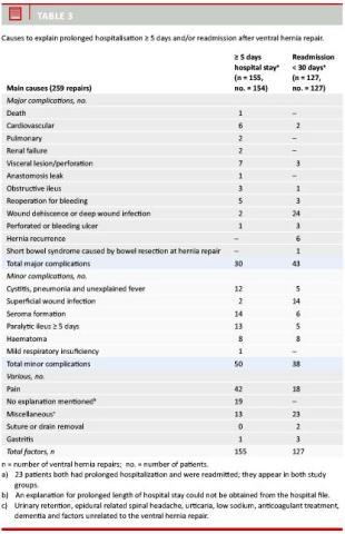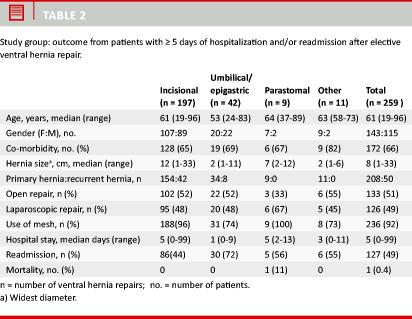 The aim of the present study was to analyse factors associated with prolonged LOS, readmission and death in a nationwide group of patients undergoing elective ventral hernia repair in search for areas of interest to improve outcome after ventral hernia surgery.