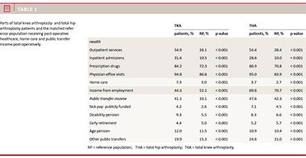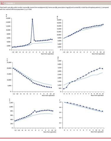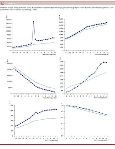 Introduction: Total hip and knee replacement (THA and TKA) are successful operations based on patient-reported outcomes and short-term socioeconomic evaluations. However, other data have shown problems regarding persistent pain and function. No detailed large-scale, long-term socioeconomic data exist on income and total health expenses before and after THA and TKA compared with a matched reference population (RP).