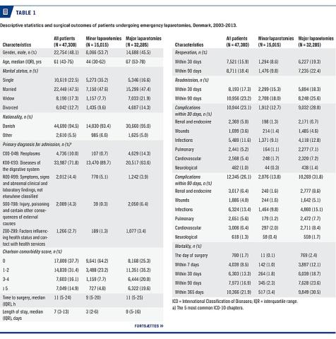 Methods: Adult patients treated with emergency laparotomy due to gastrointestinal conditions from 2003 through 2013 were identified in the Danish National Patient Register. Demographic data and surgical outcomes were identified in nationwide registers.
