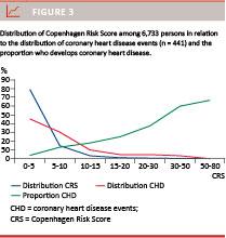 The aim of this paper was to examine relationships between the distribution of risk factors, the distribution of CHD events and the proportion of the population that develops CHD according to its level of risk. Risk factors are baseline levels of systolic blood pressure (SBP), low-density lipoprotein (LDL) cholesterol and The Copenhagen Risk Score (CRS) in relation to ten-year incidence of CHD.
