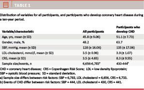 Material and methods: Baseline data from a cross-sectional study conducted in 1999-2001 comprising information on systolic blood pressure, low density lipoprotein cholesterol and a multifactor risk score, The Copenhagen Risk Score, were related to ten years of fatal and non-fatal events of CHD in 6,784 participants.