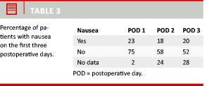 Approximately one out of five patients suffered from nausea during POD 1-3 (Table 3). However, only three departments (7%) presented a written guideline for nausea treatment. For the majority of the procedures (93%), an anti-emetic drug was prescribed as a part of the postoperative pain treatment plan in the EPM with ondansetron (88%) and metoclopramide (31%) as the most frequently administered drugs.
