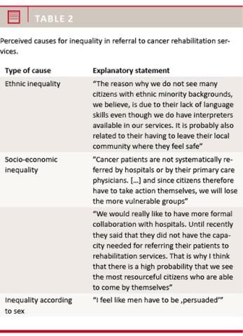 Among the 68 municipalities involved in cancer rehabilitation, 11 (16%) reported no particular inequality in the referral to services across groups of patients, whereas 27 (40%) responded “Unknown” to this question. Inequality in referral across ethnic groups was observed by 22 respondents (32%). A total of ten respondents (15%) perceived younger cancer patients to be less likely to be referred and seven respondents (10%) observed lower referral rates for males. Open-ended questions explored causes for these referral inequalities (Table 2).