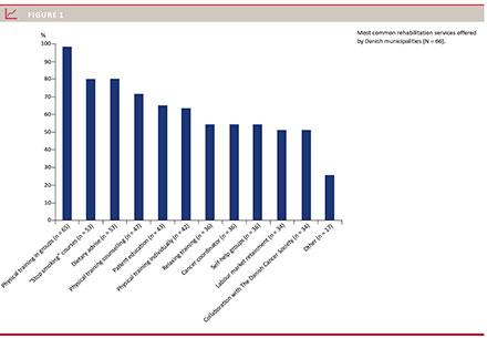 Results: A total of 91 municipalities responded (93% response rate). Of these, 75% reported that they provided cancer rehabilitation services. The number of patients enrolled was below the estimated proportion of patients needing rehabilitation services. Services consisted predominantly of physical training in groups, followed by “stop smoking” courses, dietary advice, physical training guidance, patient education and
