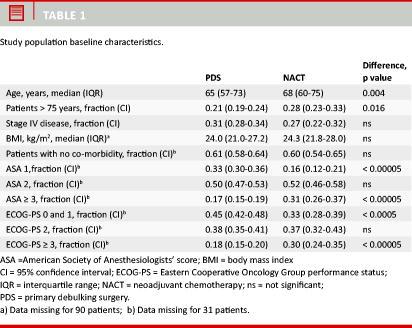 Results: Of the 1,367 eligible patients 1,069 were treated with PDS and 298 with NACT. In 2005-2007, 11% of patients were treated with NACT. In 2008-2010, this percentage had risen to 30% (p < 0.00001). Between the five referral centres, the use of NACT ranged from 6% to 41% in 2005-2010 (p < 0.00001); from 1% to 31% in 2005-2007 (p < 0.00001); from 10% to 48% in 2008-2010 (p < 0.00001) and from 9% to 48% in 2010 (p < 0.0008). Patients treated with NACT were significantly older, had inferior ASA scores and Eastern Cooperative Oncology Group performance status compared with the patients from the PDS group. There was no difference between treatments in regard to body mass index, stage IV disease or patients with no co-morbidity.