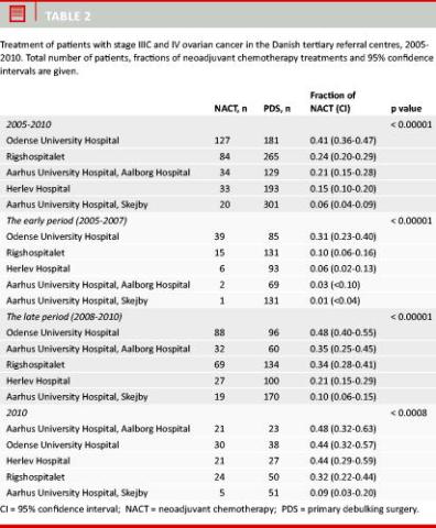 Material and methods: Stage IIIC and IV ovarian cancer patients treated in the five Danish tertiary referral centres in the 2005-2010-period were included. The study is based on validated data from The Danish Gynaecological Cancer Database.