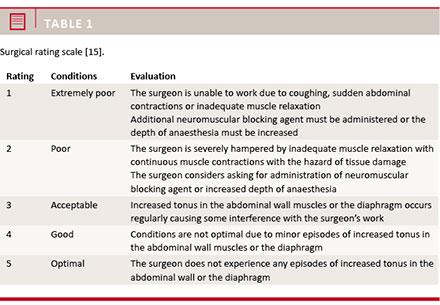 Surgical conditions are evaluated on a five-point subjective rating scale: after placement of retractors, every 30 min. (retrospectively from the previous assessment to the present) and after closure of the abdominal wall (Table 1) [13]. Applicability of the five-point rating scale was tested on five patients prior to inclusion. The surgeons, blinded to whether NMB was applied, practiced the use of the scale two at the time, and disagreements on its use were discussed and reconciled. Additionally, all surgeons received a written instruction of how to use the scale.