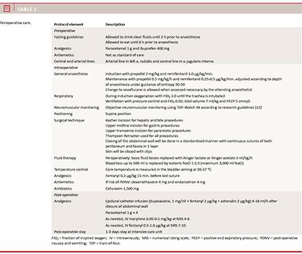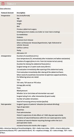 Closing of the abdominal wall will be done in a standardised manner with continuous suture of both the peritoneum and the fascia in one layer [14]. Skin will be closed with clips. A list of perioperative care is presented in Table 2.
