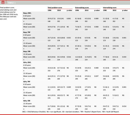 For the CBCL, the 2010 survey produced a significantly lower total problem score for boys aged 6-10 years and a lower externalizing score for both genders and age groups compared with the 1996 data.