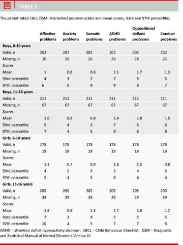 A total of 949 children aged 6-16 years (508 boys/441 girls) and their parents were invited to participate. Response rates were high; CBCL 84% (n = 793), TRF 99% (n = 938), YSR 89% (n = 434).