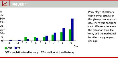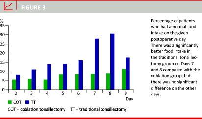 Evaluating food intake and activity levels, we compared patients who scored these parameters as "normal" with patients who scored them "below normal" (the remaining levels summarized). On Days 7 and 8, more patients in the TT group than in the COT group had a normal food intake, but on Days 1-6 and Day 9, no difference was seen between the two groups. Previous studies found no difference between COT and "control" tonsillectomy regarding food intake or return to normal activity [5, 8]. We found a reduction of intraoperative haemorrhage in the COT patients. This was also found in other studies [5, 7].