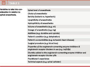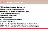The literature is scant and the issue of ACE inhibitor and ARB use before SA has not been explored in RCTs. The present paper focuses on the risk of cardiovascular instability with hypotension in the peri-operative setting, but future studies should include more potential adverse outcomes (e.g. myocardial infarction). As appears from Table 1, many variables need to be considered. Patients are often fasting for many hours be- fore anaesthesia, and the question is therefore whether optimised fluid therapy would end the discussion. Present studies have focused on ACE inhibitors and ARBs in relation to GA and have shown a tendency to increased hypotension [8-10].