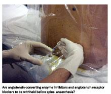 Angiotensin-converting enzyme (ACE) inhibitors and angiotensin II receptor blockers (ARBs) are drugs used for controlling arterial hypertension (HT), congestive heart failure (CHF) and diabetic nephropathy, among others. These drugs were developed several decades ago, but clear guidelines or recommendations on their use do not exist although several studies have reported severe, even fatal, side effects like hypotension when they are used in surgery patients before anaesthesia [1-5]. A pertinent question is therefore if the use of ACE inhibitors and ARBs should be discontinued in patients in general, and whether guidelines and recommendations on the subject should make a distinction between general anaesthesia (GA) and neuraxial anaesthesia as the haemodynamic effects are related to the spinal level of the anaesthesia and the attenuation of the efferent sympathetic pathway drive.