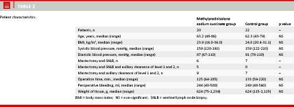 In the study period, 80 patients fulfilled the inclusion criteria; due to protocol violations, 21 patients were never asked to participate and 11 patients refused inclusion. Therefore, a total of 48 patients were randomized. Afterwards, there were six dropouts as four patients were re-operated because paraffin sections showed micrometastasis in their sentinel node, one patient randomized to the Control Group was re-operated on day three because of infection and suspicion of necrotizing faciitis, which was not confirmed. Finally, one patient randomized to the methylprednisolone sodium succinate group was treated with glucocorticoid day one after surgery due to an allergic reaction. The final study group thus consisted of 42 patients: 20 patients randomized to the methylprednisolone sodium succinate group and 22 patients to the control group. The two groups were identical in terms of patient characteristics such as age, body mass index (BMI) and blood pressure. Surgery characteristics like type of operation, operation time and peroperative bleeding were also similar in the two groups (Table 2).