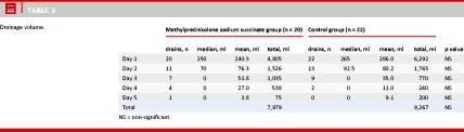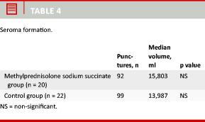 Results: There was no difference between the groups as to the number of patients having drains from day to day. The drainage volume was lower in the methylprednisolone sodium succinate group than in the control group; however, the difference was not significant (7,979 ml versus 9,267 ml). There was a tendency towards a higher seroma formation in the methylprednisolone sodium succinate group, but the tendency was not significant (15,803 versus 13,987 ml), and there was no significant difference in the number of seroma aspirations after surgery (92 versus 99).