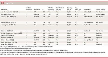undergoing THA, one study involved TKA cases, whereas five studies comprised both THA and TKA. The outcomes of the studies were assessed preoperatively and/or until discharge. Preoperative education was given within six weeks (range: 1 day-6 weeks) of arthroplasty surgery. The methods used to provide the preoperative education varied: booklets, seminars, videotapes.