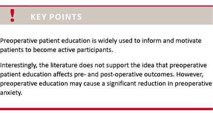 A more personalised education tailored to the patient’s specific needs may increase the general success of preoperative education. Yoon et al emphasised the advantage of an individualised and personal one-on-one education programme over a large classroom type of education as the one-to-one measures allowed patients to ask the “live” educator difficult, personal, health-related questions [15].