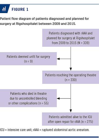 We included all consecutive patients with the International Classification of Diseases-10 code DI71.3 (ruptured abdominal aortic aneurism), surgically treated for rAAA at Rigshospitalet. Patients who died before surgery or before reaching the ICU were excluded. Also, patients with non-ruptured AAA, ruptured thoracoabdominal aortic aneurisms or iliacal aneurisms were not included. No other exclusion criteria were applied.
