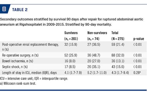 METHODS: This was a retrospective population-based cohort study of patients in the intensive care unit diagnosed and treated for rAAA at Rigshospitalet from 1 January 2009 to 31 December 2015. Patient characteristics and procedure-related variables were obtained from the medical records. The primary outcome measure was death within 90 days of the primary surgical procedure.