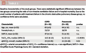 Results: We found no significant difference between the two groups with regard to age (mean 65 ± 8 years (COPD) versus mean 64 ± 16 years (pneumonia)), sex (male/female 23/19 (COPD) versus male/female 26/39 (pneumonia)) or New Simplified Acute Physiology Score (SAPS II) (mean 47 ± 11 (COPD) versus mean 51 ± 15 (pneumonia)). Treatment failure occurred in five patients in the COPD group (12%) and in 32 patients in the pneumonia group (49%), p < 0.00001. In-hospital mortality occurred in six patients in the COPD group (14%) and in 21 patients in the pneumonia group (32%), p = 0.01.