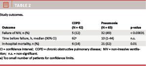 This study shows a significant difference in the efficiency of NIV in COPD patients and patients with severe pneumonia. Previous studies have shown a similar tendency with failure rates of up to 66% in patients with ARF due to severe community-acquired pneumonia (CAP) [9]. A randomised controlled trial that compared NIV as treatment for patients with ARF due to different aetiologies showed that the technique was very unsuccessful in patients with pneumonia [10]. However, another study showed that patients with both COPD and pneumonia had a better outcome with regards to the need for endotracheal intubation and two-month mortality than patients with pneumonia only [11].