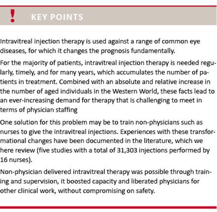 Introduction: Non-physicians such as nurses are trained to give injections into the vitreous body of the eye to meet the increasing demand for intravitreal therapy with vascular endothelial growth factor inhibitors against common eye diseases, e.g. age-related macular degeneration and diabetic retinopathy. We systematically reviewed the existing literature to provide an overview of the experiences in this transformational process.