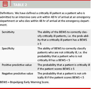 In the literature, we have not been able to find a practicable definition of critical illness. As the BEWS is to be used for identification of critically ill patients on arrival at the ED, we have chosen a rather narrow definition: a patient who is admitted to the ICU within 48 hours of arrival or who dies within 48 hours of arrival. Naturally, this definition is arbitrary.