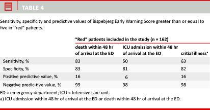 As resources in EDs are limited, a triage system also needs to have an acceptable specificity and positive predictive value in order to help prioritize the provision of rapid and competent care to the patients who need it the most. This is particularly true if the system is used to direct a considerable amount of extra resources to a particular group of patients, as is the case at Bispebjerg Hospital. The specificity of the BEWS is high and there is therefore a high probability that a person who is not critically ill according to our definition will have a BEWS < 5 and therefore will not activate a multidisciplinary team response. The relatively low positive predictive value of the BEWS among ‘‘red" patients must be perceived in the light of the low prevalence of critical illness among the ‘‘red" patients and our rather narrow definition of critical illness.