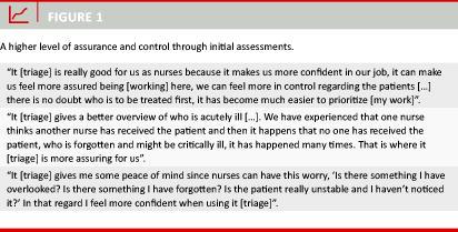 A recurrent theme in the interviews was that formalized triage resulted in a higher degree of overview and with that more assurance and control compared with the previous practice. Many of the nurses felt more in control of their work and more confident when prioritizing between patients. A reduced risk of misunderstanding the acuity of the patients’ conditions and of missing critical signs was reported (Figure 1). The standardized assessment upon arrival at the ED was reported as the main reason for the increased level of assurance. According to the nurses, triage had made it easier for them to prioritize between patients, had reduced their fear of overlooking something important in the initial assessment and had caused a shift in their focus from working diagnosis to urgency assessment involving both vital signs and ESS.