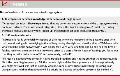 Conclusion: Introducing a formalized triage system in the ED was experienced to give a better overview and more overall control of ED patients. Adequate resources are needed to ensure that a stronger focus on documentation and re-evaluation related to triage does not produce a feeling of professional inadequacy among the staff.