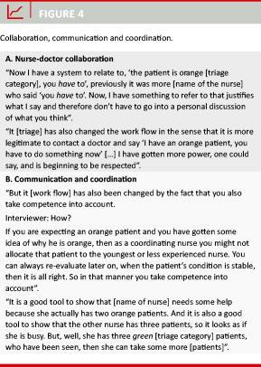 Communication was found to be improved by the triage system (Figure 4). The triage manual clearly stated the maximum time allowed before a patient was to be seen by a doctor which reduced the amount of discussion between the nurse and the doctor on which patients to see first (Figure 4A). The triage system made it easier to distribute patients to the relevant areas of the ED, and when overcrowding developed to safely transfer patients with lower triage categories to less crowded areas (Figure 4B). Allocating and prioritizing clinical staff to patients was also facilitated by the triage system (Figure 4B). In addition, some of the coordinating nurses perceived the formalized triage level categorizations to be more telling in respect to urgency and thus more relevant as a basis for prioritization than the less situation- and patient-specific (working) diagnoses used before the triage system was introduced.