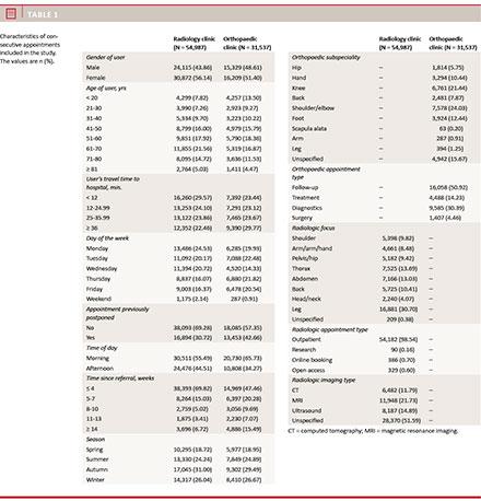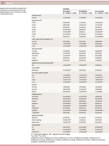Methods: The study was based on appointments scheduled from June 2013 to March 2015 at an orthopaedic and a radiologic outpatient clinic. Data on outcomes of cancellation on the part of the user or the provider, and non-attendance without giving notice were collected from administrative systems along with appointment characteristics. Logistic regression was used for statistical analysis.