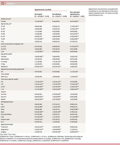 Results: Of the 54,987 and 31,538 appointments scheduled at the two departments, 4,524 (8%) and 5,479 (17%) were cancelled and 2,905 (5%) and 1,249 (4%) were unattended without notice. The latter was significantly associated with male gender, younger age and longer time since referral. Other characteristics were identified as significant, but differed between departments.