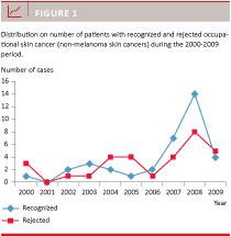 Results: A total of 36 patients were recognized as occupational skin cancer cases. The mean age was 61 years (44-75 years), 31 men and five women. The most frequent diagnosis was basal cell carcinoma followed by squamous cell carcinoma. No cases of malignant melanoma were recognized. The primary risk factor for development of occupational skin cancer was ultraviolet (UV) exposure during outdoor working.