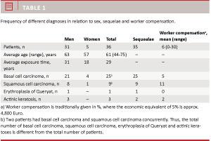 A total of 36 patients with skin cancer (or premalignant skin conditions) recognized as occupational disease within the defined period were identified, 31 men and five women, their mean age was 61 years (range 44-75 years).