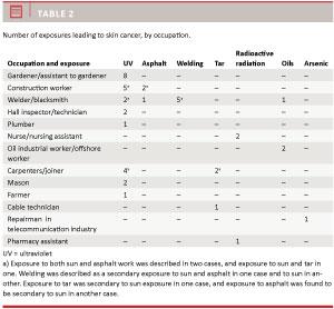 Introduction: Skin cancer may, in some cases, be caused by occupational exposures. The aim of this study was to investigate the prevalence of and exposures leading to occupationally induced skin cancers in Denmark during a ten-year period.