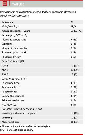 The inclusion period of this study covered the period from December 2005 to August 2010. In this period, EUS-guided transmural drainage of pseudocysts was performed in 22 consecutive patients at Gentofte Hospital. Demographic patient data are displayed in Table 1.