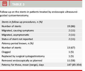 Stent migration caused two patients (9%) to develop symptomatic recurrence of the PPC. In one case, the migrated stent was replaced with a second stent under a repeated EUS-guided procedure. This second stent successfully drained the PPC and caused the symptoms to disappear. In the other case, an attempt to replace the migrated stent was unsuccessful.