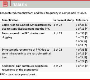 The median follow-up was 230 days (range 85-1,547 days). During this period four patients (18%) developed complications related to malfunctioning of the stent. Stent clogging caused one patient (5%) to be hospitalized with epigastric pain, infection and recurrence of the PPC. This case was managed with a nasocystic drain.