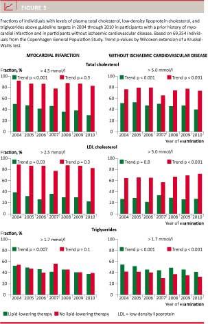 The present data do not provide explanations as to why large factions of individuals with and without ischaemic cardiovascular disease, or with diabetes, do not receive lipid-lowering therapy, or do not have lipids treated to target values according to guidelines. However, medical doctors at hospitals and in general practice as well as the patients themselves all have part in the decision on whether to take lipid-lowering therapy or not, and in the decision on which type of lipid-lowering therapy to use. During hospitalisation, individuals with ischaemic cardiovascular disease and/or diabetes simply may not be prescribed lipid-lowering therapy. Also, if seen in general practice, doctors may not prescribe lipid-lowering therapy or may even decide to stop lipid lowering-therapy although such drugs were prescribed by hospitals. Finally, patient compliance may be poor either because of real or perceived side effects, or because of a wish not to take medications in general. Importantly, in Denmark it is unlikely that lipid-lowering therapy in general is not taken due to the cost, as the least expensive simvastatin 40 mg costs less than 0.2 Euro daily. However, part of the explanation as to why many patients on lipid-lowering therapy did not reach lipid targets may, indeed, be the cost as the more potent statins atorvastatin and rosuvastatin were 10-30 fold more expensive than simvastatin in Denmark in the period from 2004 through 2010; because atorvastatin lost its patent in Denmark May 2012 and in many other countries soon, the cost as an explanation for not reaching lipid targets may disappear in the near future. Other potential explanations as to why individuals treated with lipid-lowering therapy still have lipid values above guideline targets include 1) a low starting dose which has not been adjusted according to lipid levels, 2) side effects of lipid-lowering therapy that may require a lower dose than needed to reach guideline targets, 3) lack of patient compliance resulting in omission or partial omission of lipid-lowering therapy in the dose and frequency prescribed and last, but not least, 4) doctors’ lack of knowledge of current guidelines [15].