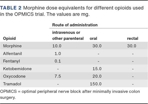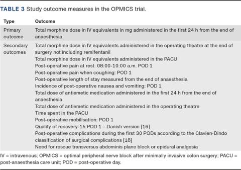 The primary outcome is total morphine dose in intravenous mg equivalents administered within the first 24 hours after arrival to the post-anaesthesia care unit. Morphine dose equivalent conversion is done using the rates provided in Table 2 [17]. Secondary outcomes are specified in Table 3.