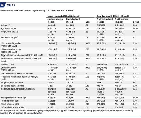 This was a retrospective cohort study. The DADD cohort includes all patients with diabetes who have had contact with a hospital outpatient clinic for adult patients in Denmark. The clinician in charge of each patient’s care submits data to the DADD annually. This study describes a subset of the DADD patients. Specifically, our inclusion criteria were type 2 diabetes mellitus, age above 40 years of age, followed at a hospital clinic for a minimum of 12 months, and a minimum of one fractionated lipid measurement including an LDL result within the previous 24 months.