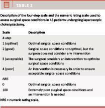 – Surgical space conditions upon dissection of the gallbladder (four-step scale and NRS 0-100) – rated during surgery.