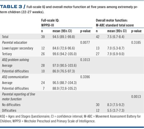 Results: The study included 141 extremely and 210 very preterm live-born children, and among these 87 and 199 survived to discharge, respectively. The full-scale IQ was not significantly lower in children with potential developmental difficulties according to the ASQ. Children with parental reporting of fine motor difficulties had a poorer overall motor function (mean difference 2.8 (95% confidence interval (CI): 1.2-4.5)) and fine motor function (mean difference 3.4 (95% CI: 1.7-5.1)) than children with no reported fine motor difficulties.