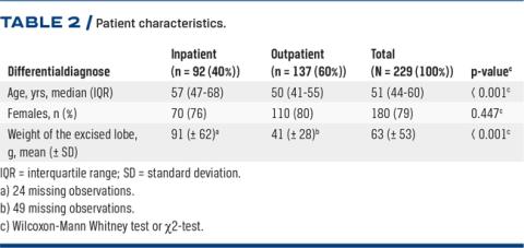 The patients in the outpatient setting were significantly younger than the patients in the inpatient setting, but no gender difference was seen (Table 2).
