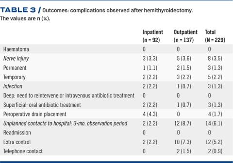 RESULTS: Hemithyroidectomy was performed in 229 patients. For 137 patients, the procedure was planned in an outpatient setting; and among these, 124 patients (91%) were completed as planned. None of the patients in either the outpatient or inpatient setting experienced PTB. In the outpatient group, 1.5% had permanent nerve injury of the recurrent nerve and 0.7% had a superficial wound infection which was treated with oral antibiotics.