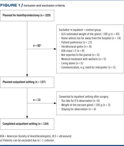 Traditionally, hemithyroidectomy has been an inpatient procedure with a minimum of 1-2 days of post-operative observation in the hospital due to the risk of serious post-operative complications. The major concern is the possible development of post-thyroidectomy bleeding (PTB), which may lead to a potentially life-threatening compression of the trachea [1]. The first description of hemithyroidectomy in an outpatient setting was described in the US [2] in 1986. Since then, the number of hemithyroidectomies and total thyroidectomies in an outpatient setting has increased [3, 4] especially in the US. Many of these studies have shown that outpatient thyroidectomy is safe and feasible with the incidence of PTB ranging from 0.19% to 0.48% [5-9]. There is no international consensus of the selection criteria for outpatient thyroid operations. The American Thyroid Association has developed a guideline for selection of patients for outpatient thyroidectomy focusing on American Society of Anesthesiologists (ASA) class, patient understanding/capabilities and home/geographical environment [10]. European studies have similar criteria, but no generic European guidelines exist [11-13].