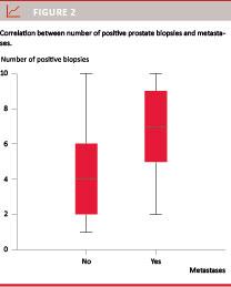 N1 was found to be positively correlated with number of lymph nodes removed (p = 0.006) in L-PLND; this finding could not be demonstrated in e-PLND. Sex positive needle core biopsies out of ten biopsies correlated positively with N1 (p = 0.003) (Figure 2). There was no correlation between the side of detected cancer by prostate biopsies and the side of pelvic lymph nodes metastases, preoperative PSA and N1, and between cT and N1.
